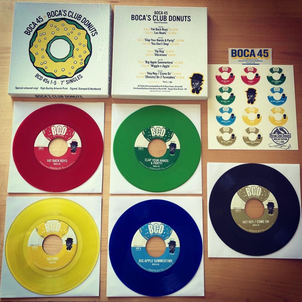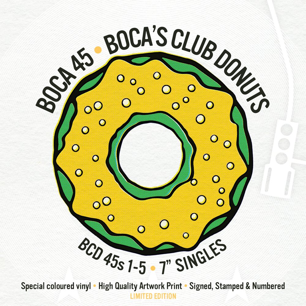Well now, throughout 2018, 45 Live's very own Boca 45 conceived, launched and smashed out a series of 45s called Boca's Club Donuts. This is the culmination of 20+ years of making music and rockin' 2 turntables across the globe, a set of records that honestly reflects his DJ style, musical influences and impeccable taste, 5 double A-side BANGERS guaranteed. Only 300 of each were pressed on the single releases, and all sold out unbelievably fast, often in just 24 hours. The demand most definitely outstripped supply so this extra special ltd edition box set is a welcome arrival for anyone who missed the singles completely or indeed need to complete their set, or who are just straight up completists. All 5 donuts are pressed onto coloured vinyl and also comes with a WAV download card for all 10 tracks which will please multi-format DJs for sure, an exclusive artwork print and housed in a bespoke card box, so nice!