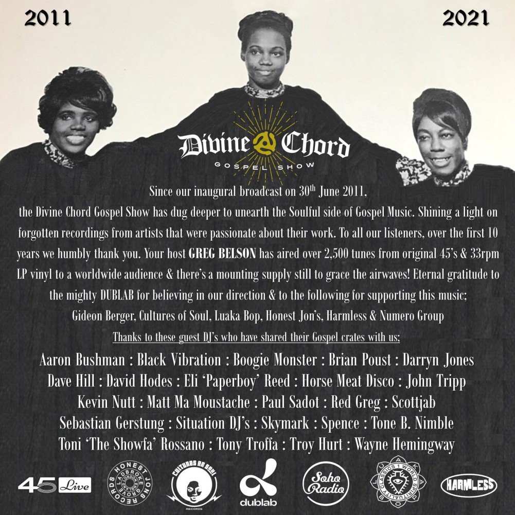 Coming up at the end of June 2021, it's the 10 Year Anniversary of the DIVINE CHORD GOSPEL SHOW, with your host DJ GREG BELSON broadcasting on the mighty dublab.com.