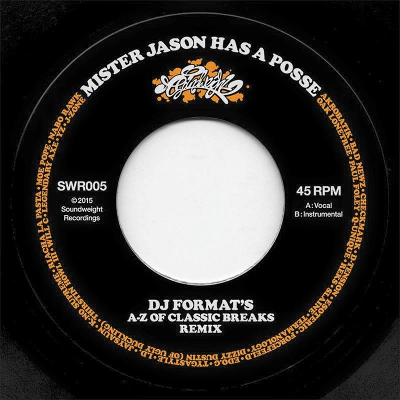 First time out on a 45, the breaktastic DJ Format mix of Mister Jason Has A Posse. What can you say? a mega mix of oh so mighty proportions, chock full of all the breaks we love, seamlessly spliced, and crammed full of the kind of energy that Format acheives so successfully time after time. ESSENTIAL 45 on Soundweight that will need to be bagged fast.