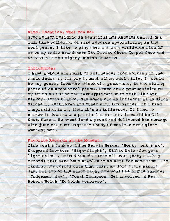 "If there ever was a busy DJ, it’s Greg Belson. The globetrotting selector of soulful and funky music splits his time between the States and Europe each year moving from festival to festival and every gig in between. A member of the 45 Live Crew, and a respected member of the DJ community, his Divine Chord Gospel Show and 45 Live show on dublab.com are all time. He’s been a vinyl archaeologist for 25 years, unearthing unknown records and bringing them to the masses, who in turn, move their asses. We’re excited to have him in this installment of Big Ups. Sit back and enjoy Mr. Greg Belson’s insightful words."