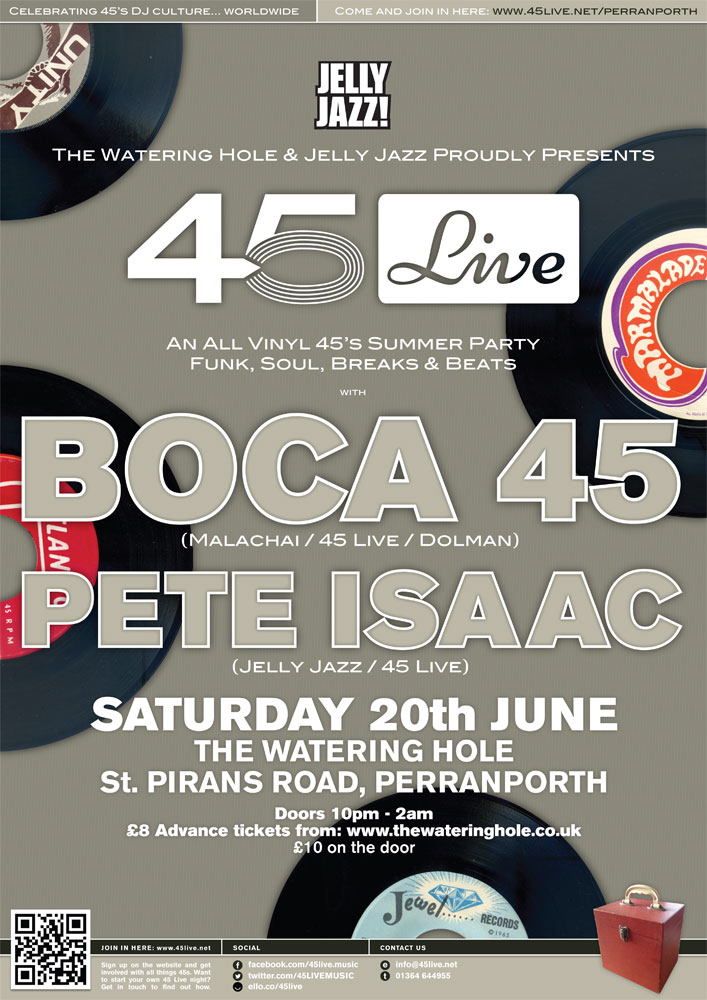 After the immense 45 Live session at The Masked Ball recently, 45 Live head honchos Pete and Boca head back to Cornwall for a summer party at the amazing Watering Hole venue right on the beach. We'll be rockin' 100% 45s, taking in funk, hip hop, psyche, soul, boogaloo and breaks. Should be another corker!