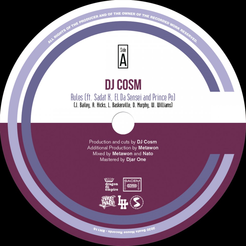 Beats House Records have been busy since the current lockdown plunged the entire world into a forced creative hibernation state and it's fair to say the current crop of recording artists on the label have used the time wisely. Case in point is Dragon Fli Empire's DJ Cosm who with this boom bap heatrock restores our faith in the posse cut by featuring three heavyweight emcees in Sadat X, El da Sensei and Prince Po. Heavily armed with the beats and cuts to snap necks clean off, DJ Cosm produced this cut for the label that is a perfect example of pure hip hop goodness plain and simple. Flip the 45 for the Djar One remix and another fix of teflon friendly beats for the rap trio to rhyme over. It's time to wheel out the barbeque and set the hi-fi speakers on the window sill and invite everyone over for the ultimate summer time jam.